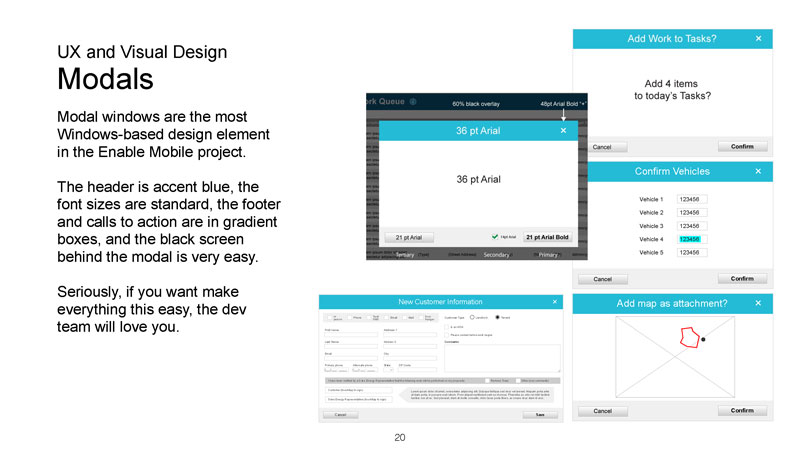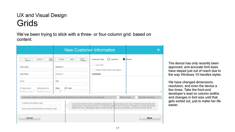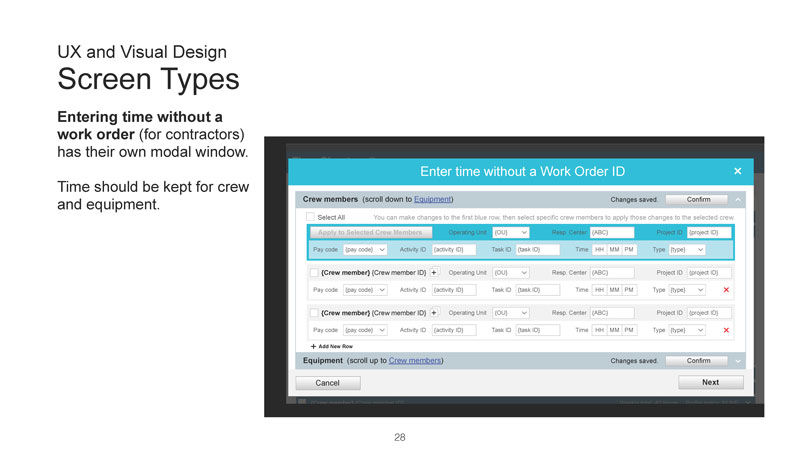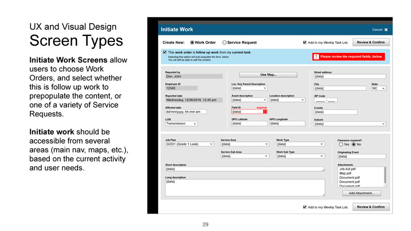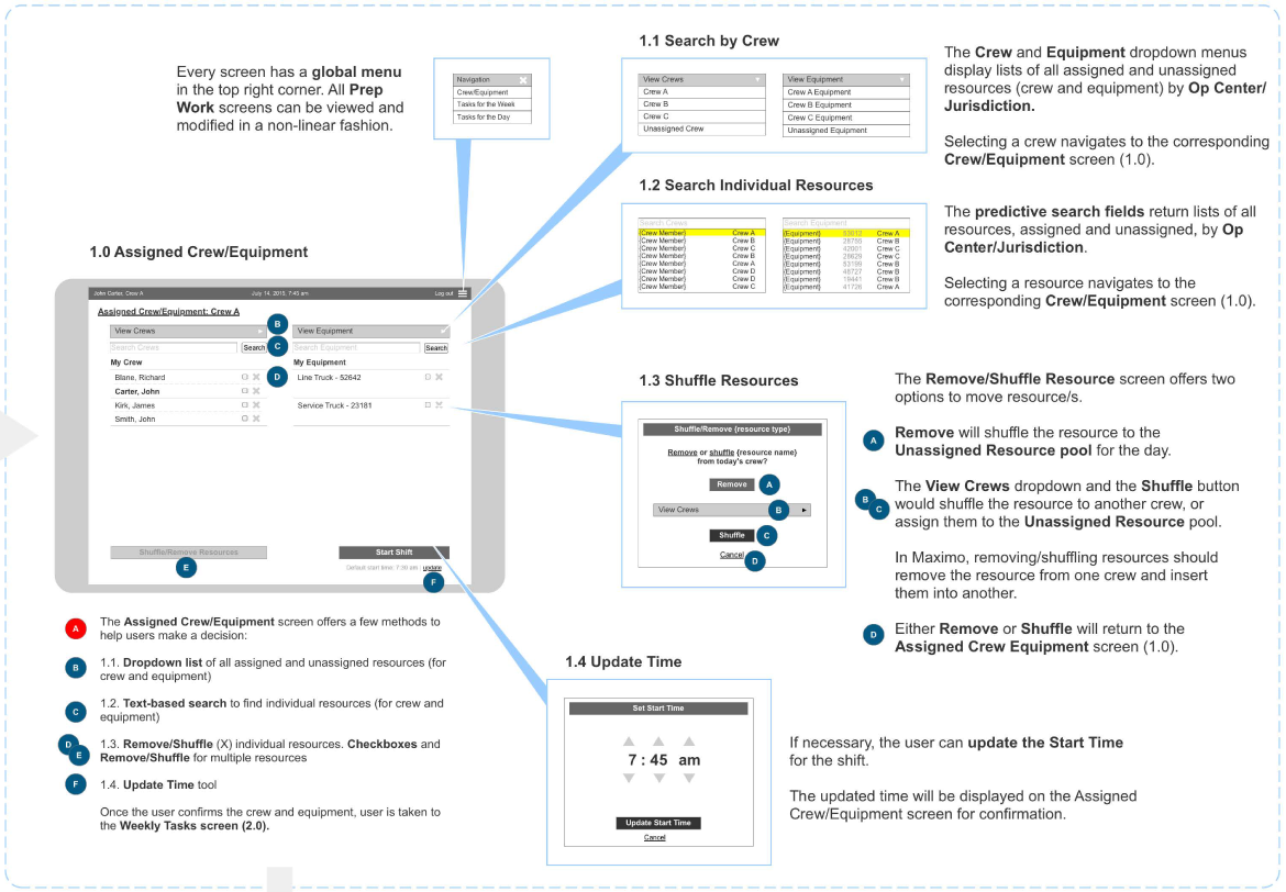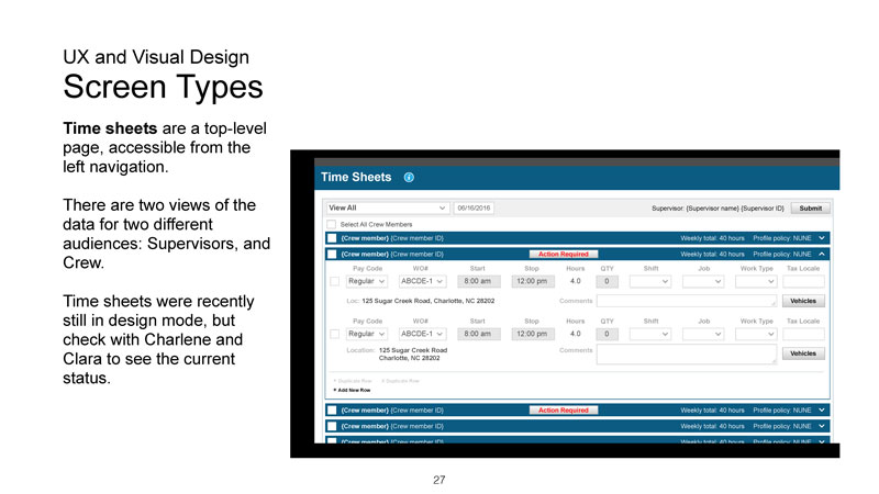 The application had to be easier to use than paper. I designed the interfaces, the icons, the style guide, and the paper and rapid prototypes for the design team and development team, and trained the team and client's employees to present to stakeholders.
