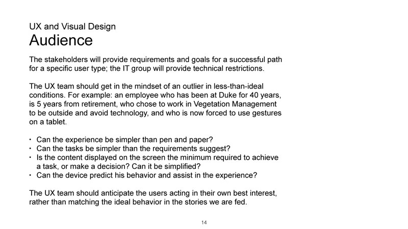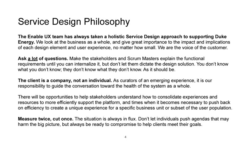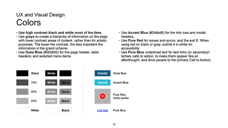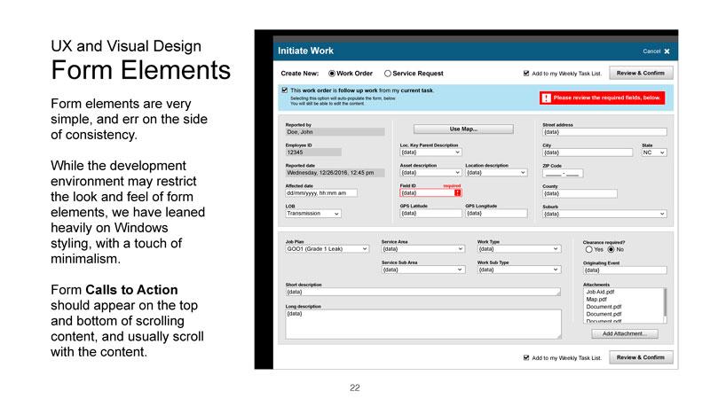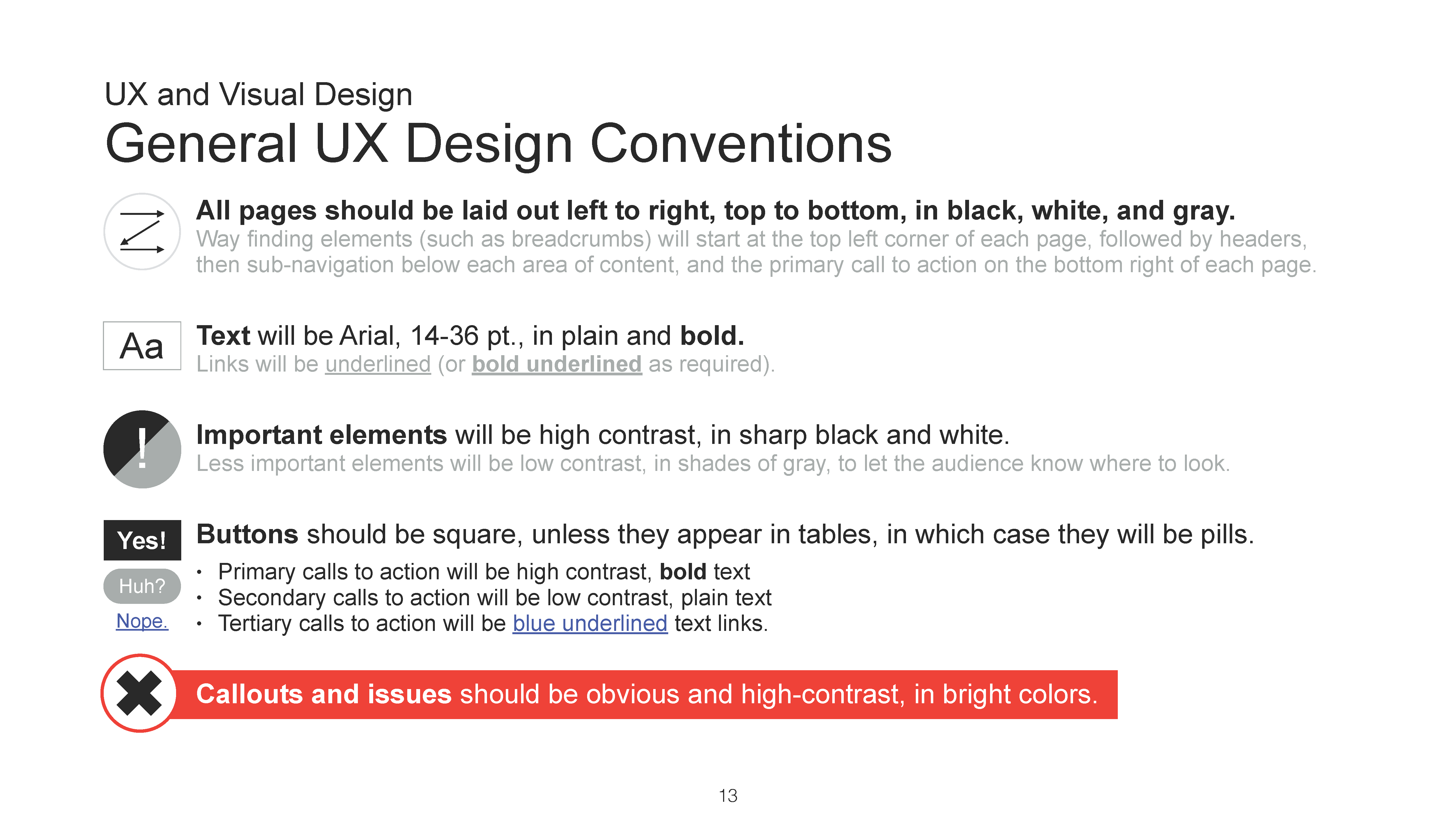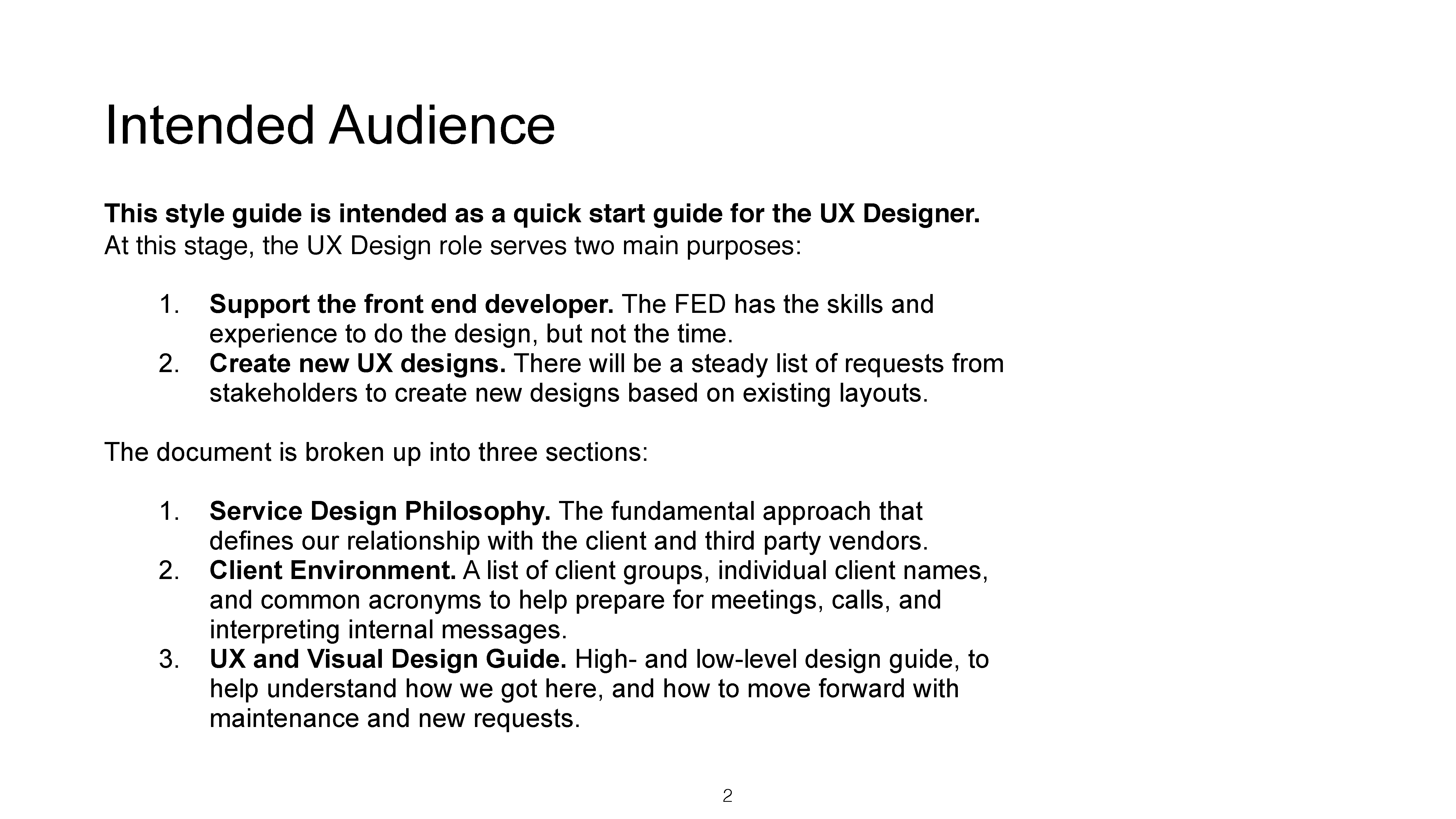 The UX Design guide had to not only describe the design standards, but also educate and inform an ever-changing population of employees and subcontractors who didn't necessarily understand the role of UX Design in the workflow, and to give them the language and tools to evangelize the role and benefits of UX Design in the process.